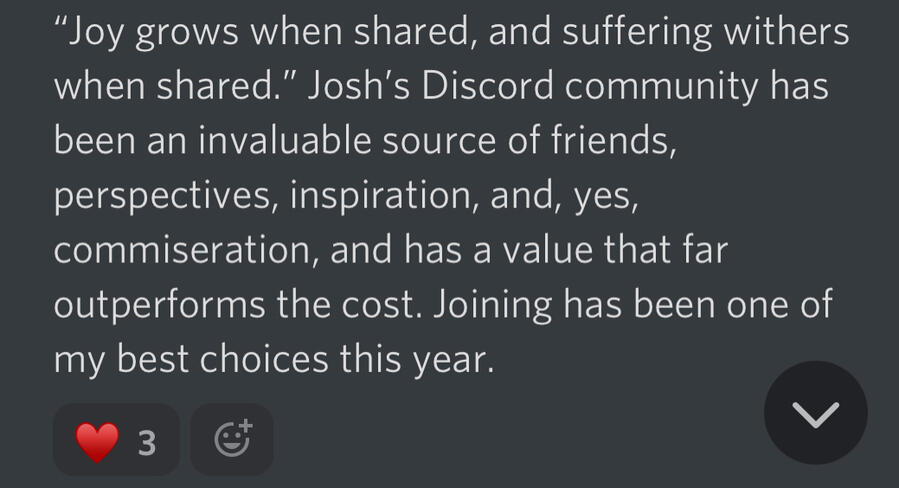 ...and much more.2. Member-Led Discussions: Most Thursdays at 7 PM Central Time, join in on group calls led by other community members to recap, chat, and dive deeper into the ideas discussed on Monday.3. In-Depth Course: Explore my course on the fundamentals of human progress, Mental Models, based on the short book I wrote. The course provides detailed explanations and exercises to support your personal growth journey.4. Interactive Chat Rooms: Engage with our diverse community of go-getters, including business owners, artists, content creators, investors, web developers, and more. Share your experiences, ask questions, and support each other on your self-improvement journey.5. Ongoing Support and Accountability: Feel free to tag me in the chatrooms anytime, and I'll answer your questions and provide coaching on the calls.